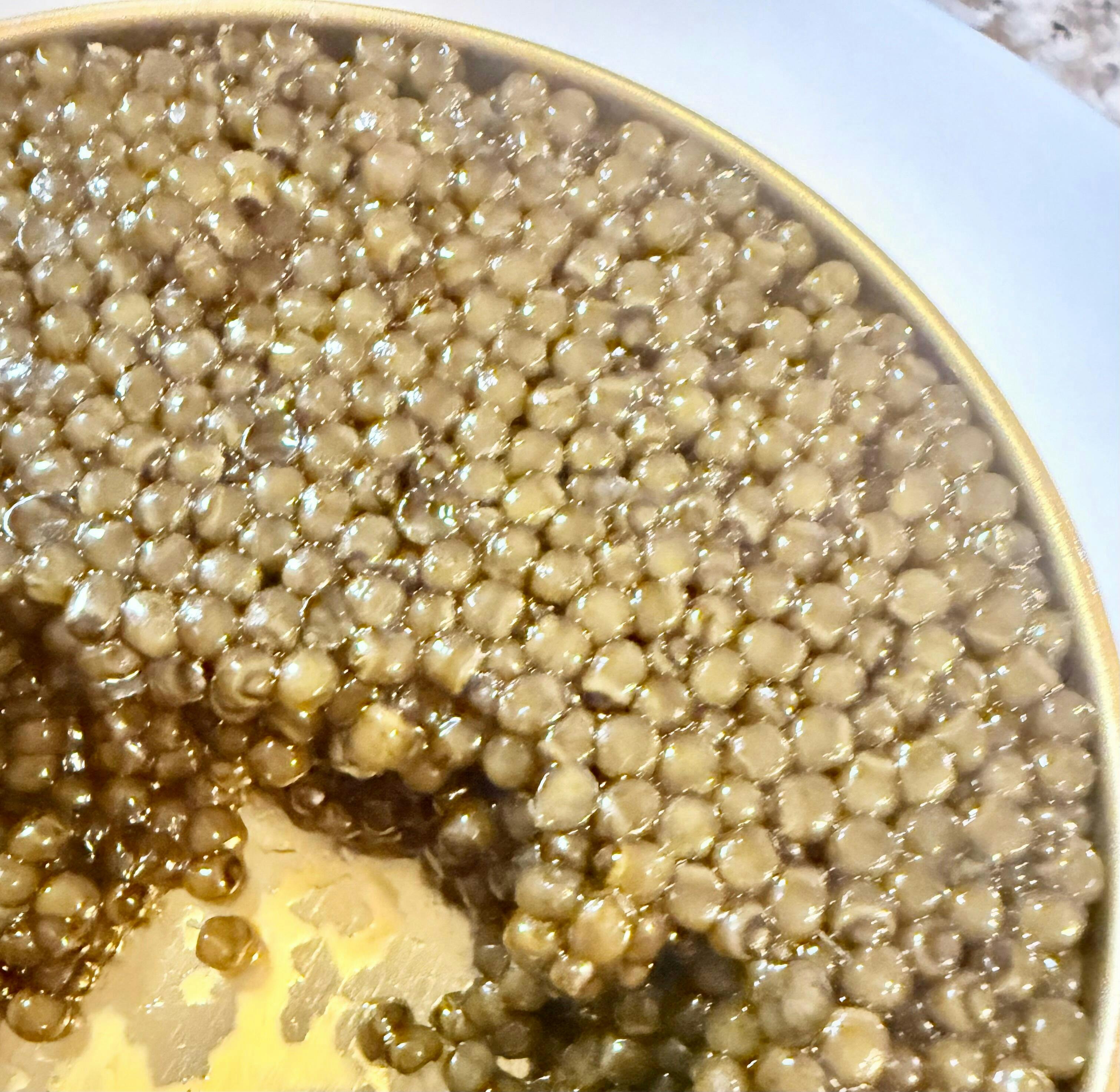 Kaluga Hybrid caviar features impressively large, firm pearls—often 3.2mm or larger—with luminous shades of silvery grey, olive bronze, or golden brown. The grains are glossy and consistently shaped, with an elegant, high-end finish.